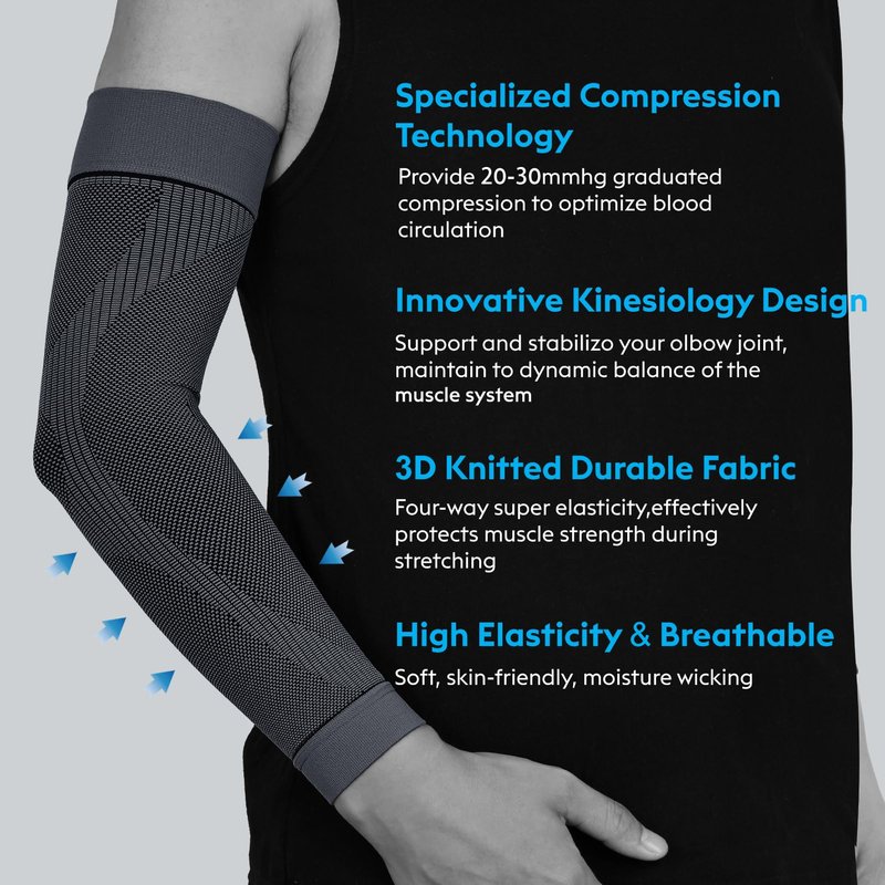 - Graduated Compression for Perfect Support: Firm 20-30 mmHg graduated compression arm sleeves for elbows, arms, and forearms, offer targeted compression and improved blood circulation, relieve swelling, also have heating effect for muscular recovery; Offer optimal muscular support between workouts and during casual everyday activities. With our arm support sleeves, you’ll be able to tackle any activity life throws at you, while ensuring you’re a step ahead in injury prevention!