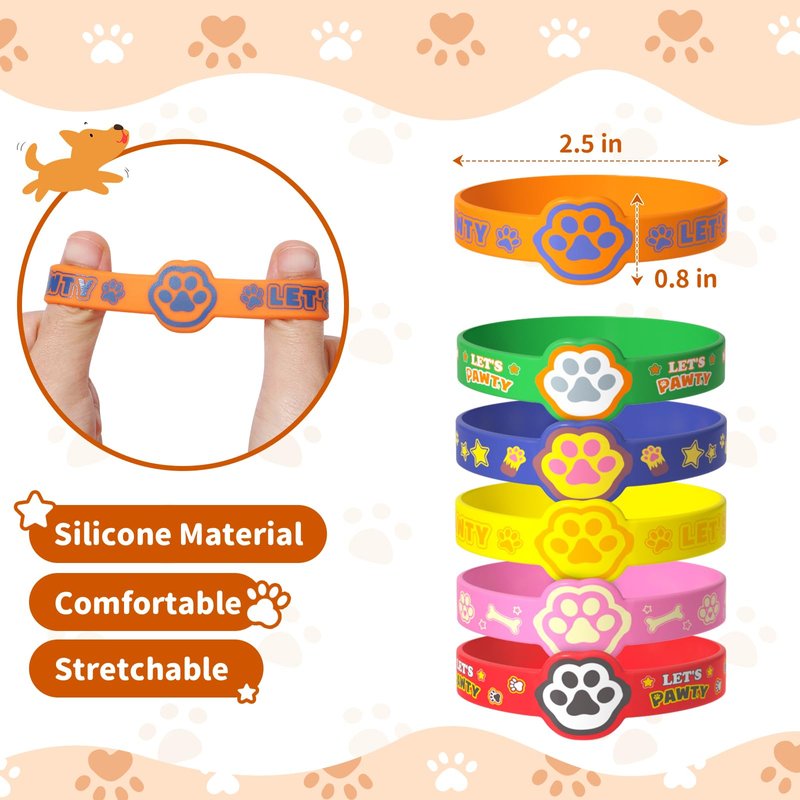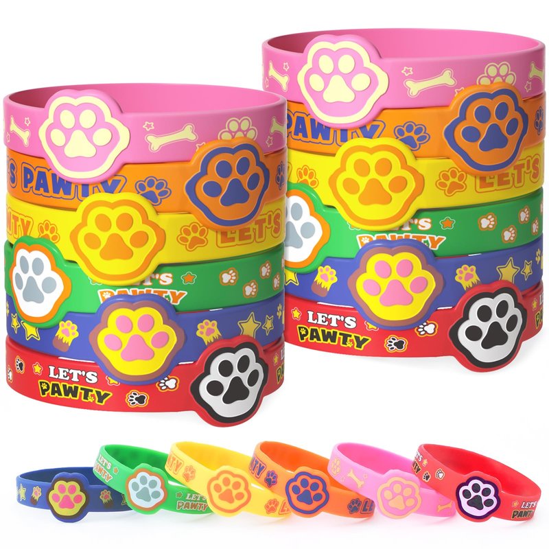 - Amazing Paw Party Favors Set: Our dog paw silicone bracelet set is a the nice gift tailor-made for pet lovers. Contains 24 wristbands in 6 styles, each carefully designed with cute dog paw patterns. These bracelets are not only the highlight of the party, but also the favorite of children and adults. They are colorful and cute, which can inspire children's love for pets, make the party more lively and interesting, and bring endless joy to guests