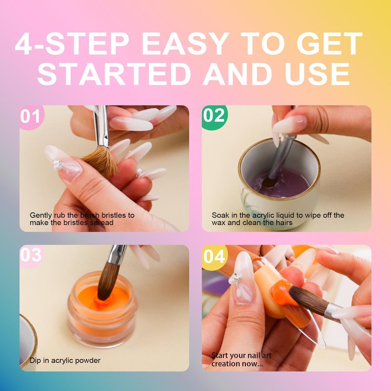 - 【Clean and Storage】After every application on single nail, make sure to clean the acrylic brush with brush cleaner to prevent the acrylic powder from clumping.Do not use acetone, it will remove the shine, make acrylic tacky and buildup residue. After cleaning, remove moisture with a paper towel, reshape, and keep it in the upright position.
