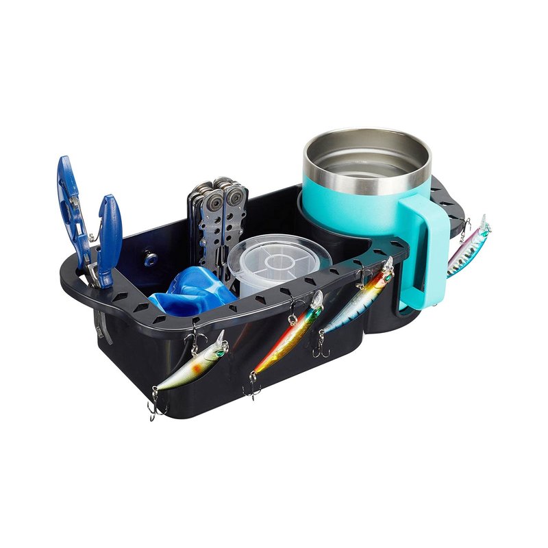 This boat organizer can hold your drinks, gadgets, pliers, knives, and more. The holes around the edge are great for hanging fishing lures. Whatever items you need, it always holds them in place and keeps them tidy