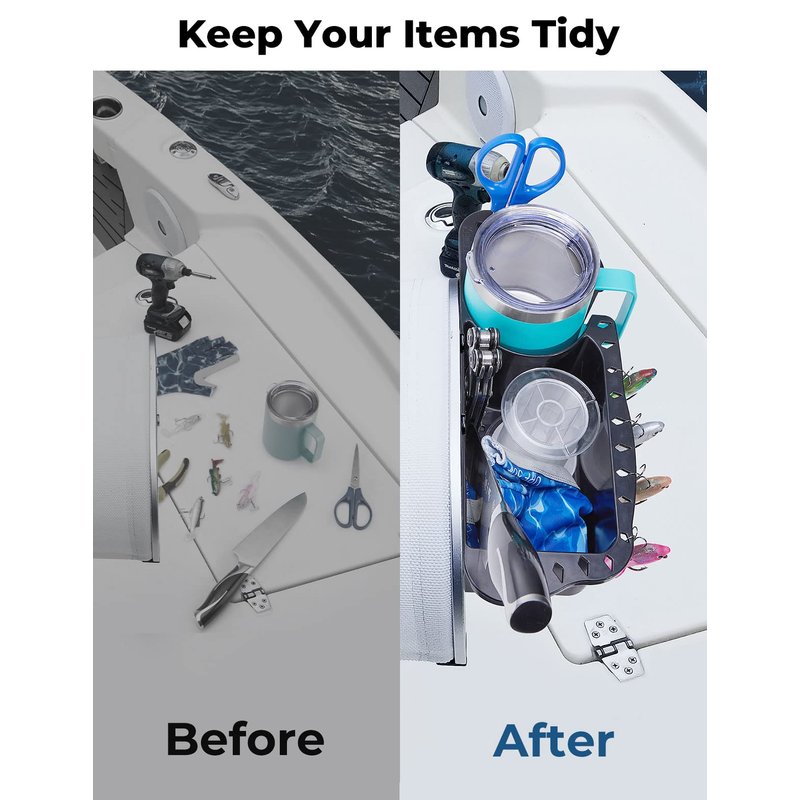- Tough & Reliable - Made of high-quality ABS, it can hang firmly by attaching with screws. Unlike other suction cups that lose suction quickly, this boat fishing caddy is built to last. You can also use a hook & loop tape to install it temporarily.
