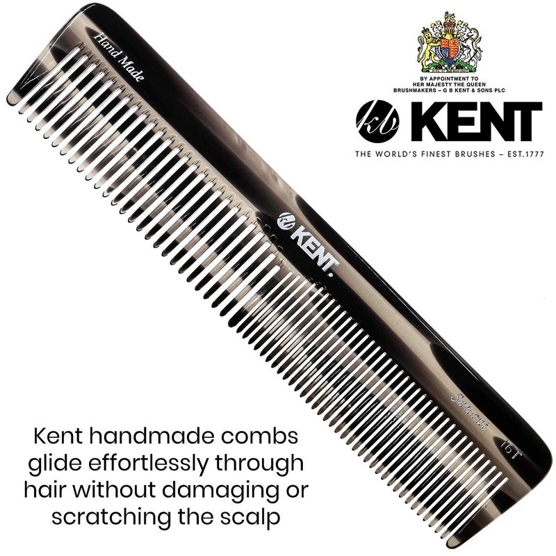 16T Dresser Comb: 7.2 Inch Large Tortoiseshell / Graphite finish. ABOUT KENT'S HANDMADE COMBS: Kent Handmade Combs for Men and Women Range are of excellent quality. Kent hand sawn combs are cut from large sheets of cellulose acetate rather than moulded, producing a truly gentle comb whereas moulded combs often snag and damage the hair. This material is tactile, flexible and strong. They glide effortlessly through hair without scratching to damaging the hair or scalp. Kent combs have rounded teeth which ensure a smooth and comfortable action. The range includes designs for thick and fine hair, in varying sizes, for both men and women. About Kent: Founded in 1777, Kent Brushes is the world's oldest hairbrush manufacturer and has maintained its British traditions of producing the world's finest hairbrushes and combs ever since. Making the best quality brushes for over 230 years and creating over 250 products. Quality, design and attention to detail go into each brush. They have been the holders of The Royal Warrant through the last nine consecutive reigns of British monarchy. The company continues to retain the craftsmanship and unprecedented quality that is Kent's reputation.Even in today's fast moving, mass-produced assembly lines, they are proud to still be manufacturing many of their original brushes by hand.