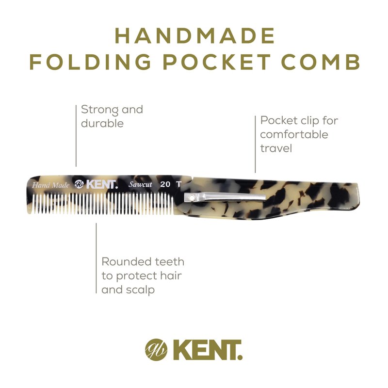 Kent 20T TW Handmade Folding Pocket Comb for Men, Fine Tooth Hair Comb Straightener for Everyday Grooming Styling Hair, Beard or Mustache, Use Dry or with Balms, Saw Cut Hand Polished, Made in England