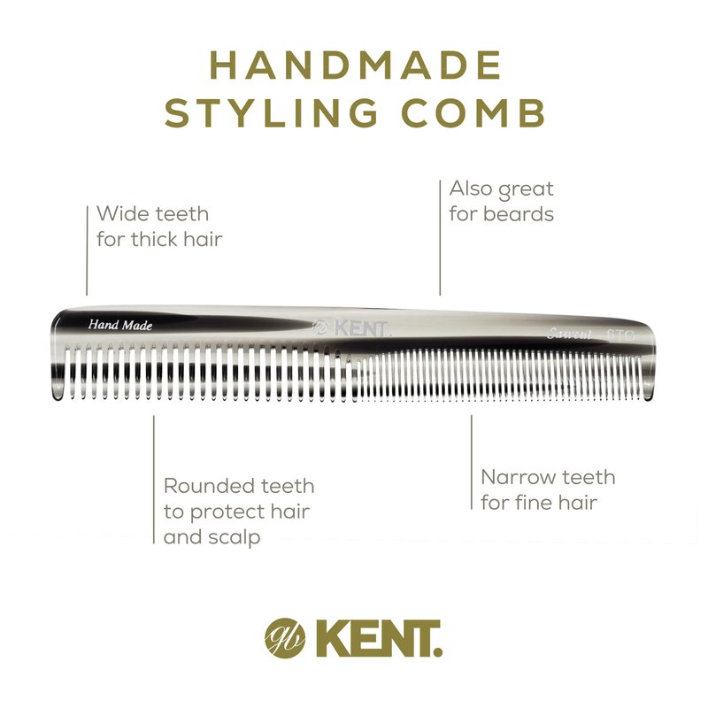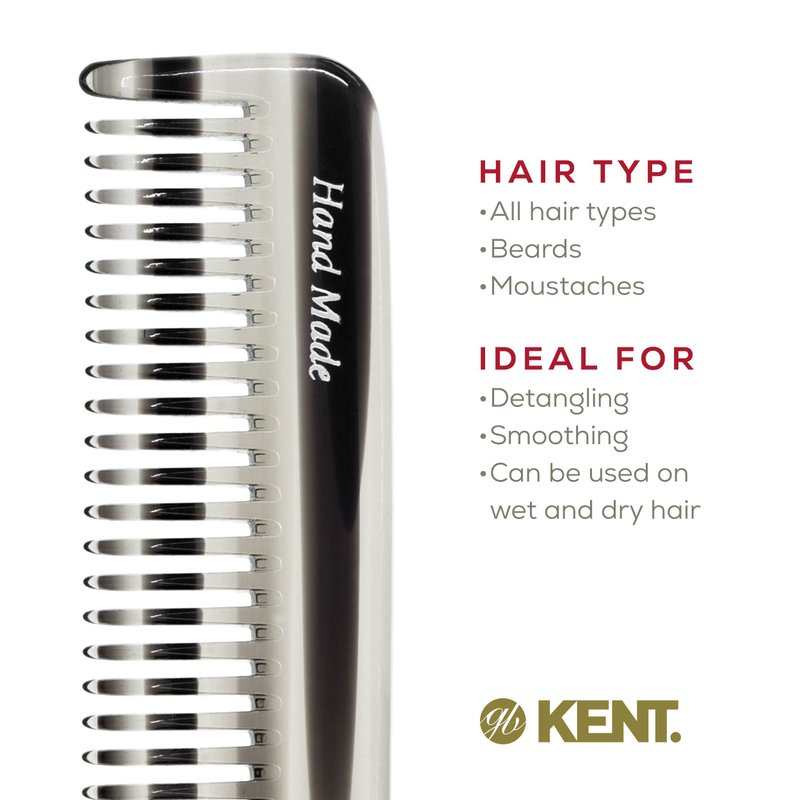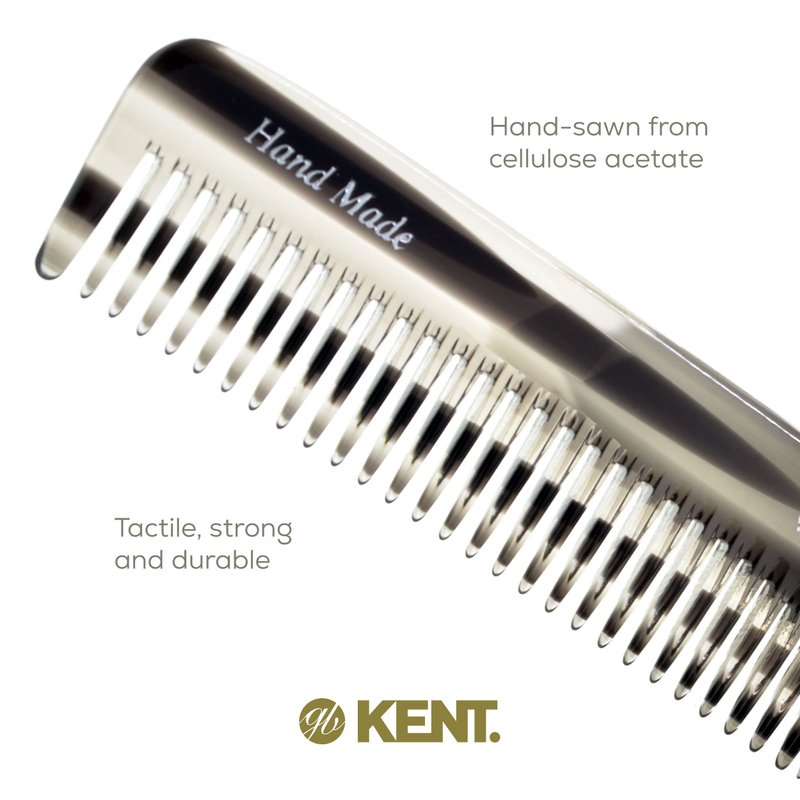 ABOUT KENT'S HANDMADE COMBS: Kent Handmade Combs for Men and Women Range are of excellent quality. Kent hand sawn combs are cut from large sheets of cellulose acetate rather than moulded, producing a truly gentle comb whereas moulded combs often snag and damage the hair. This material is tactile, flexible and strong. They glide effortlessly through hair without scratching to damaging the hair or scalp. Kent combs have rounded teeth which ensure a smooth and comfortable action. The range includes designs for thick and fine hair, in varying sizes, for both men and women. About Kent: Founded in 1777, Kent Brushes is the world's oldest hairbrush manufacturer and has maintained its British traditions of producing the world's finest hairbrushes and combs ever since. Making the best quality brushes for over 230 years and creating over 250 products. Quality, design and attention to detail go into each brush. They have been the holders of The Royal Warrant through the last nine consecutive reigns of British monarchy. The company continues to retain the craftsmanship and unprecedented quality that is Kent's reputation.Even in today's fast moving, mass-produced assembly lines, they are proud to still be manufacturing many of their original brushes by hand.