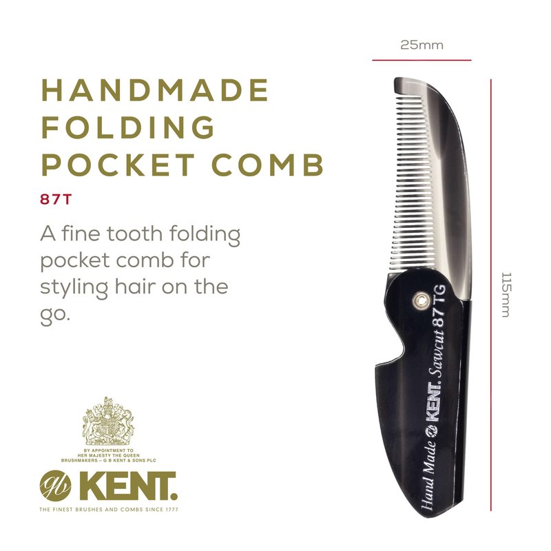 Kent 87T Graphite Handmade Folding Pocket Comb for Men, Fine Tooth Hair Comb Straightener for Everyday Grooming Styling Hair, Beard or Mustache, Saw Cut Hand Polished, Made in England (3 Pack)
