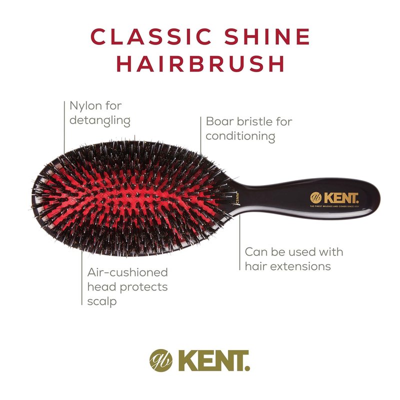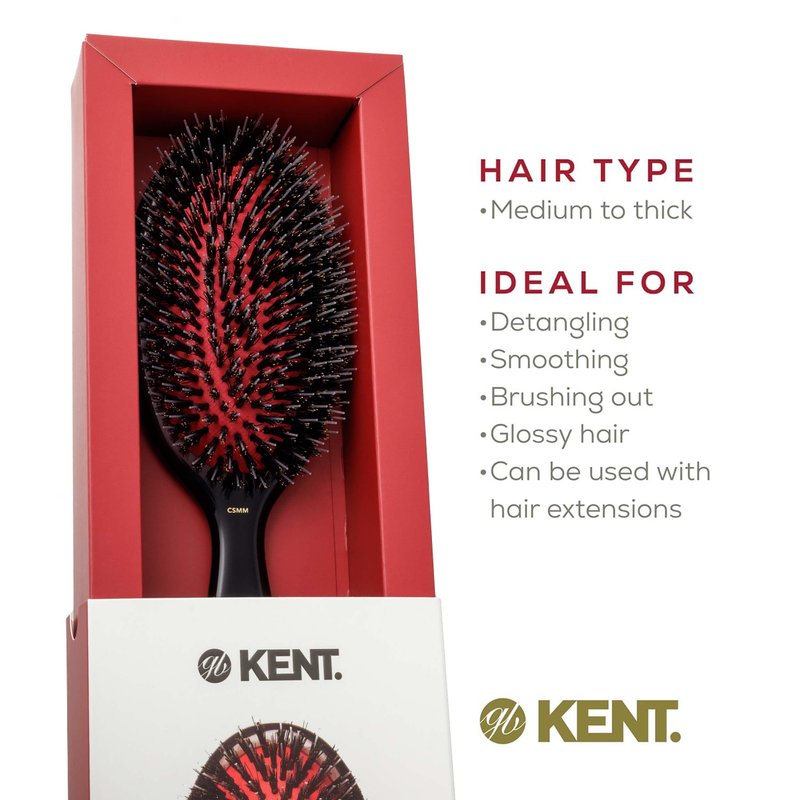 Kent CSMM Classic Shine Medium Oval Cushion Straightening Brush - Natural Black Boar Bristle Hair Brush with Nylon Quills - Shine Hair Brush and Scalp Scrubber for Shoulder to Mid Length Hair