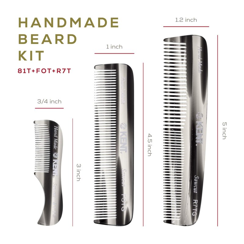 Get 3 of the bestselling Kent Men's Handmade Combs: 81T, FOT and R7T. The 81T: 73mm fine toothed mustache and beard comb. This specialist comb is perfect for grooming, maintaining and trimming facial hair FOT: 113mm fine toothed men's pocket comb R7T: 143mm fine and coarse toothed pocket comb. Every Kent comb undergoes the traditional craft of shaping and cutting from solid blank tortoiseshell effect material. Each tooth is cut by special circular saws, profiled, beveled and hand-polished on pumice wheels to ensure perfect hair penetration without scratching the scalp. Another unique feature is that the inside edge of each tooth is left with the rough saw-cut impression which, when the hair is drawn through the teeth, cleans the hair of dust and encourages the release of natural hair oils. Hand-made Kent combs are the ultimate in daily hair care and the mark of distinction. ROYALLY RECOGNIZED SINCE 1777: Kent started out as G. B. Kent and Sons PLC back in 1777 as a family owned business. Today, Kent is the world's oldest brush manufacturer as well as one of the oldest companies in Great Britain. Proudly displaying the Royal Warrant of Her Majesty the Queen, Kent continues to make high-quality products; including hair brushes, combs, makeup brushes, body brushes, shaving brushes, and clothing brushes. Experience the quality that has continued for 240 years.