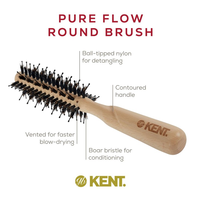 A 45mm diameter spiral filled radial brush made from beech wood and filled with the finest stiff black bristle. The bristle grips the hair and encourages shine. Brushing hair is the simplest beauty treatment there is, easing tension and stress from the head and neck. Brushing stimulates and encourage essential oils in the scalp to flow through the hair strands nourishing and protecting each hair, leaving it smooth and naturally shiny. Bristle strengths vary for fine or thick hair, and for best brushing performance it is important to use the right bristle strength. A bristle is similar to a hair in construction, and sections cut from nearer the root of the bristle are strongest and best for brushing thick hair, while sections from the tip or flag end are softer and more suited to fine hair and a delicate scalp. All brush designs are suitable for traditional brushing or blow drying. The Kent Legacy: Founded in 1777, Kent Brushes is the world's oldest hairbrush manufacturer and has maintained its British traditions of producing the world's finest hairbrushes and combs ever since. Making the best quality brushes for over 230 years and creating over 250 products. Quality, design and attention to detail go into each brush. They have been the holders of The Royal Warrant through the last nine consecutive reigns of British monarchy. The company continues to retain the craftsmanship and unprecedented quality that is Kent's reputation.Even in today's fast moving, mass-produced assembly lines, they are proud to still be manufacturing many of their original brushes by hand.