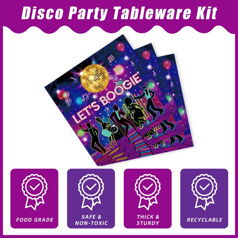 - Retro Theme Design: Get the party started with our retro and interesting style design! The 70s disco party tableware kit is made of 70s themed elements, such as music records, disco balls, dancers and other patterns, and features "Let's Boogie" slogan printed on the items. Disco party bundle are a hit with people of all ages, making them be a great decoration for 70s, 80s and 90s party