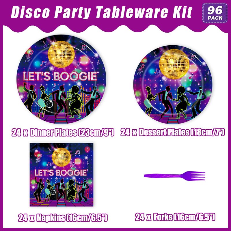 - Complete 70s Party Decoration Set: Our 70s theme party tableware set includes everything you need for a party of 24 guests - 24 70s party paper dinner plates (9''), 24 70s paper dessert plates (7''), 24 70s napkins (13''), and 24 forks (6.5''). Perfect for hosting your party with ease