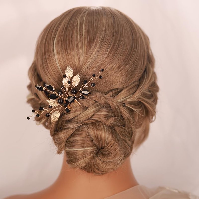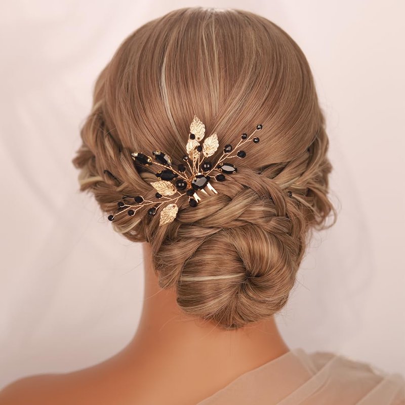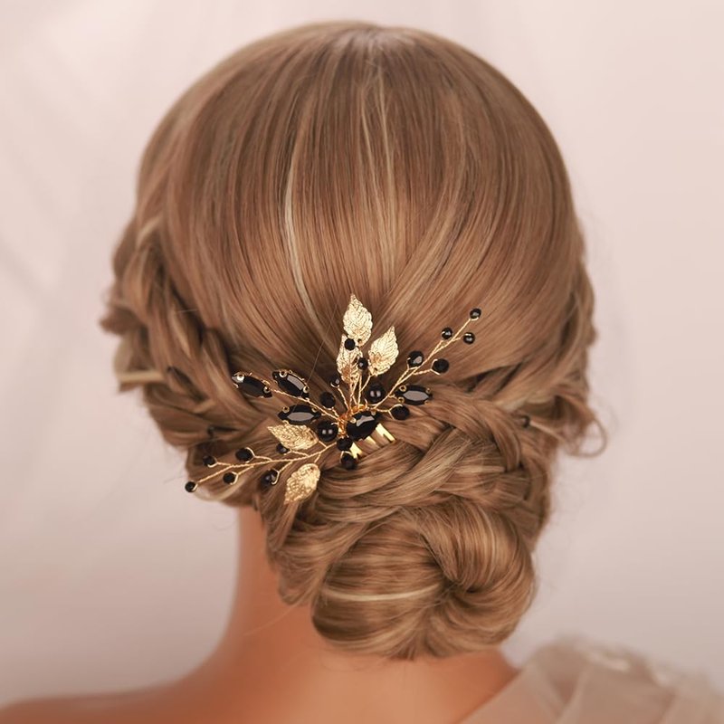 Kercisbeauty Dainty Black Rhinestones Beads Gold Leaf Hair Comb for Women Girls Wedding Bridal Hair Piece Jewelry