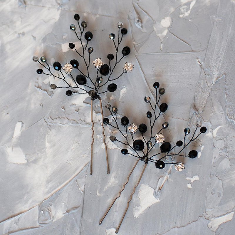 Kercisbeauty Handmade Wedding Hair Pins with Black Crystal Beads Rhinestones for Brides Bridal Hair Piece Prom Women Hair Accessories 2pcs