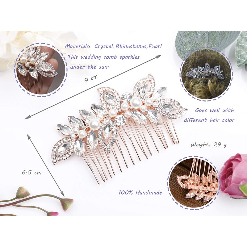Kercisbeauty Wedding Bridal Bridesmaids Flower Girl Rhinestone Crystal Leaf Rose Gold Hair Comb Slide for Prom,Bun Hair Accessory (Rose Gold)