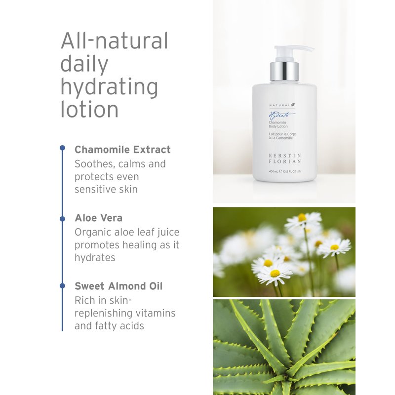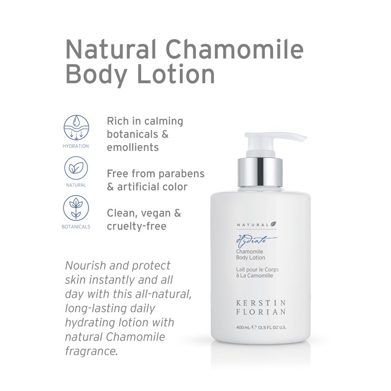 Leave your skin feeling soft, smooth and hydrated with Kerstin Florian's daily moisturizing body lotion featuring soothing chamomile aromatherapy and nourishing protective sweet almond oil and aloe vera.