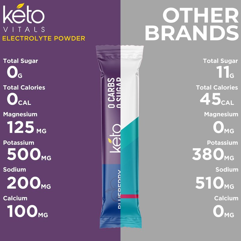 Keto Vitals Electrolyte Powder is the best source of keto friendly electrolytes on the market! Experience increased energy, elevated mood, healthy muscle function and deep sleep right away. Replenish and hydrate your body better than a liquid iv hydration could! There aren't many essentials on a low carb diet, but an electrolyte replacement supplement is a critical component of a sustainable low carb lifestyle. This ketogenic electrolyte supplement is tailored to the very specific needs of low-carb dieters. Don’t be fooled by multivitamins – what your body needs is Keto Vitals! We will keep your body balanced so you can maintain peak performance! These keto friendly electrolytes are recommended by many keto and low carb dieters - from stay at home moms to endurance runners and bodybuilders. Ingredients NO CALORIES | NO CARBS | No artificial sweeteners, flavors or colors or artificial ingredients. | 30 servings per box Each serving (1 stick pack) contains: 500 mg Potassium 360 mg Chloride 200 mg Sodium 125 mg Magnesium 100 mg Calcium Our electrolyte supplements are equally suited for ketogenic, Atkins, low carb, zero carb, and carnivore diets. Electrolytes are natural hydration boosters and energy replenishers! Improve your sleep and get freedom from muscle cramps! Our keto friendly electrolytes will let you enjoy the natural calm of magnesium and thrive! Our Formula Our formula has just the right balance of Potassium, Chloride, Magnesium Citrate, Sodium (Salts) and Calcium to bring your body into alignment! Our Electrolyte Powder is the perfect keto drink mix to ensure your keto journey succeeds!