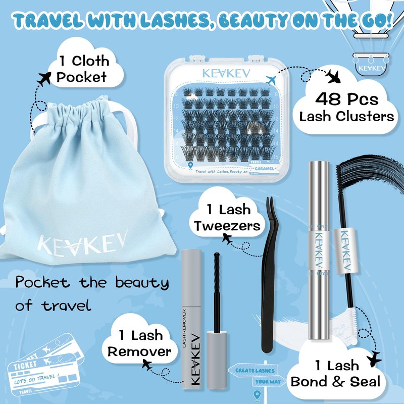 - Pocket the Beauty of Travel: Get a glamorous look wherever you go with this portable travel lash kit. The kit includes 40 clusters of lashes, 1 double-ended lash bond and seal, 1 lash remover, and 1 lash tweezer. A soft fabric pouch is included to hold all these lash tools, so beauty goes with you.
