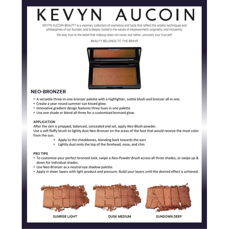 - PRO TIPS: To customize your perfect bronzed look, swipe brush across all three shades or swipe up and down for individual shades. Use Kevyn Aucoin’s NEO-BRONZER as a neutral eyeshadow palette. Apply in sheer layers with light product and pressure. Build your layers until the desired effect is achieved.