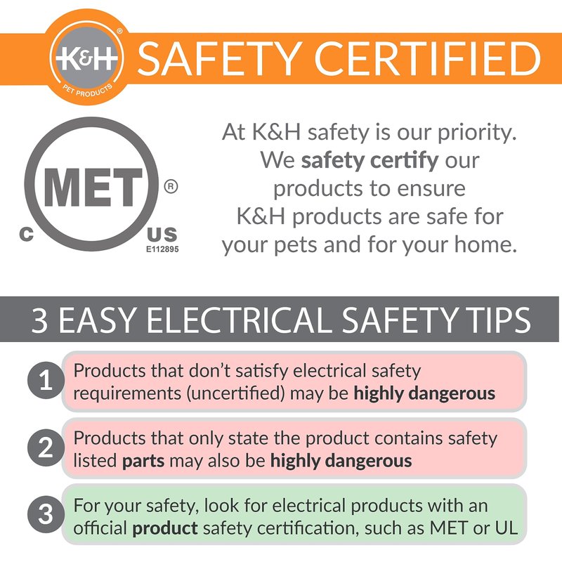 - SAFETY: We don't just use safety listed parts, we safety certify the entire product. The K&H Pet Bed Warmer has been tested & certified by MET Labs and exceeds USA/CA electrical safety standards