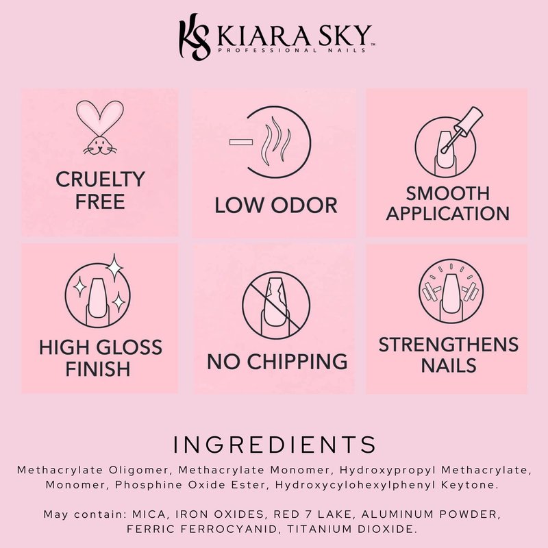 - Kiara Sky Gel Polish are Low Odor, Cruelty Free, Offer a Smooth Application with a High Gloss Finish. The formula Strengthens nails and does not chip. INGREDIENTS: Methacrylate Oligomer, Methacrylate Monomer, Hydroxypropyl Methacrylate, Monomer, Phosphine Oxide Ester, Hydroxycylohexylphenyl Keytone. May contain: MICA, IRON OXIDES, RED 7 LAKE, ALUMINUM POWDER, FERRIC FERROCYANID, TITANIUM DIOXIDE.