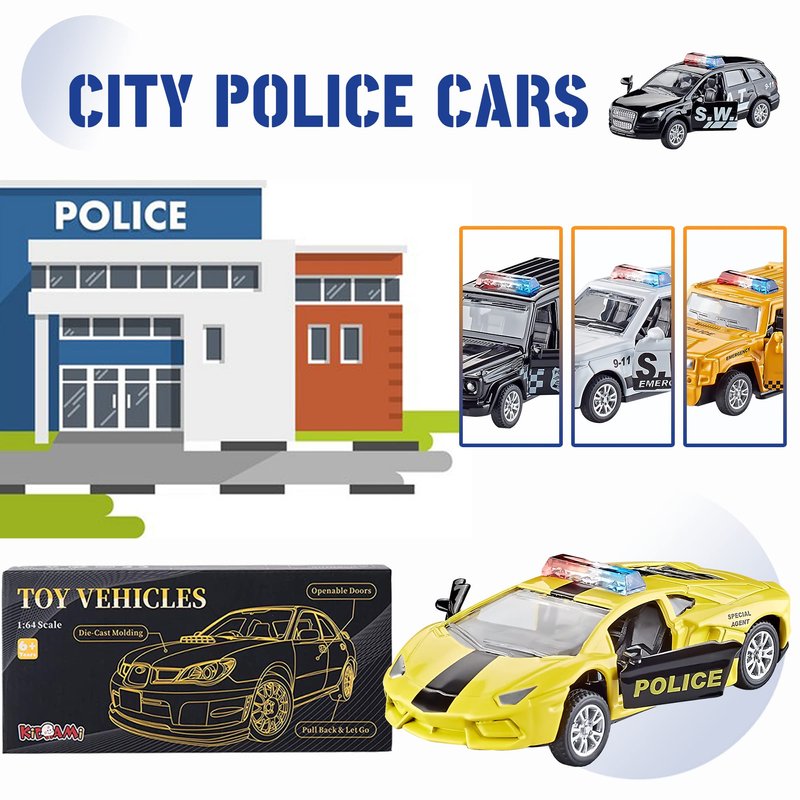 - DIE CAST TOY CAR: Set of 5 die-cast police vehicles (1 : 64 scale) . New package is 9.4 x 4.2 x 1.7 inches, cars’ approximate size is the same 3.2 x 1.5 x 1 inches. They are LITTLE cars even kind of mini, so remember to check the size before you order