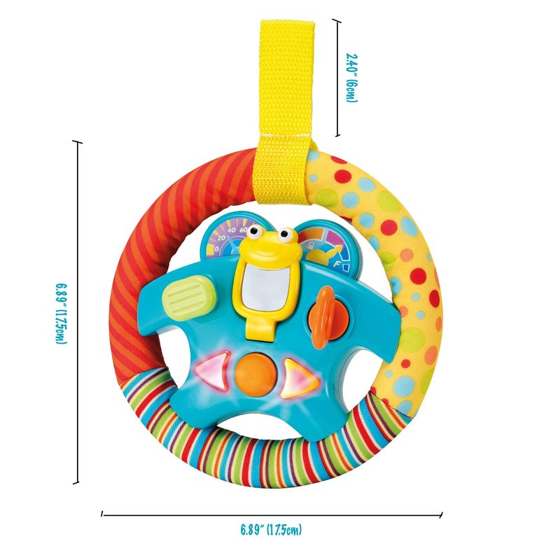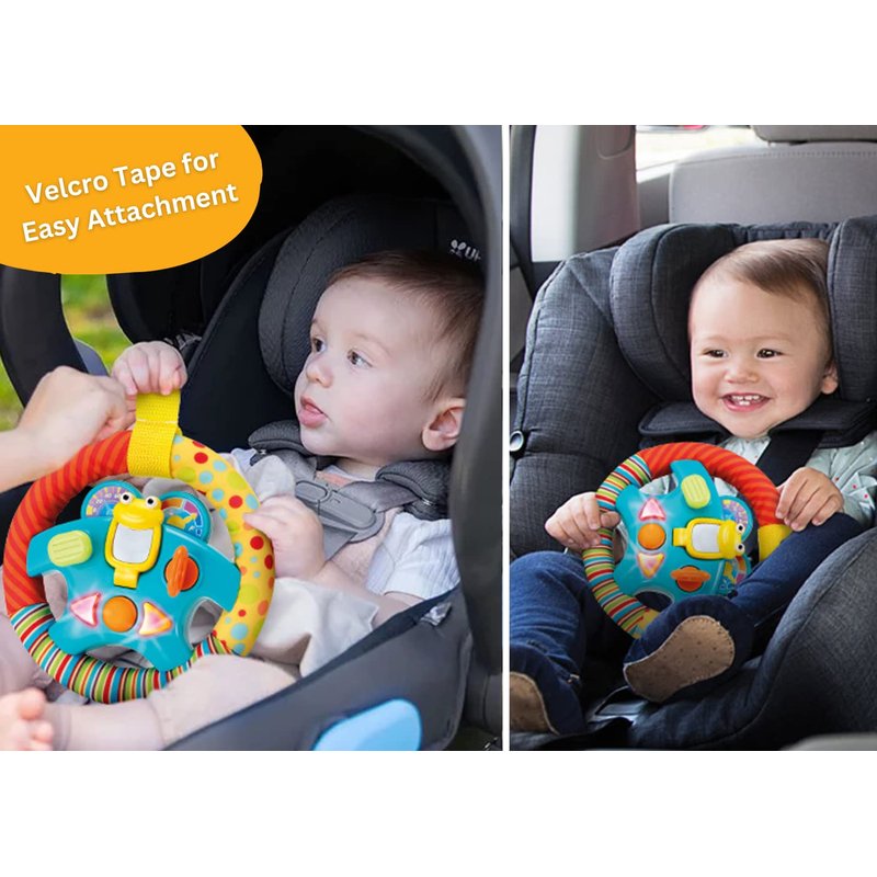 - A TOY THEY CAN’T LOSE – In a couple of seconds, a strong velcro strap attaches this fun fabric toy steering wheel to your car, stroller, play pen or high chair. Baby toys for the 3 to 12 months set tend to be quickly dropped or thrown, but not this one!