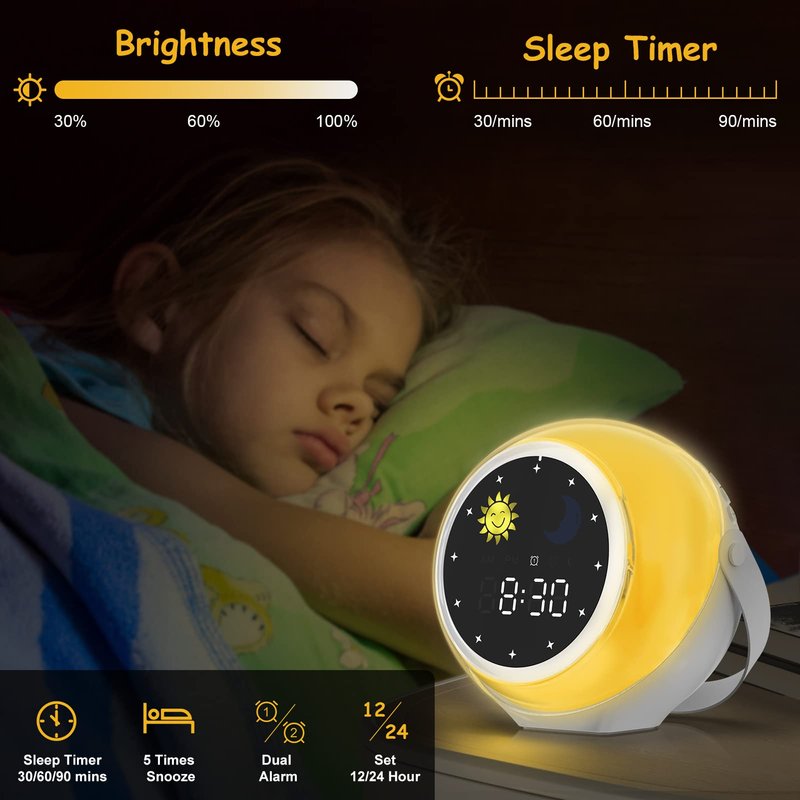 - 【Rechargeable Time Training Clock】: The icon settings of the moon and sun are customizable; they will switch automatically at the time you set. In addition to the function of an alarm clock, there is also a function of a sleep timer. Let the children to know and understand time in a more interesting way, and train them to get up or go to bed at a specific time during the day/night. Children can also sleep for extra 5 minutes by pressing the "Snooze" button.
