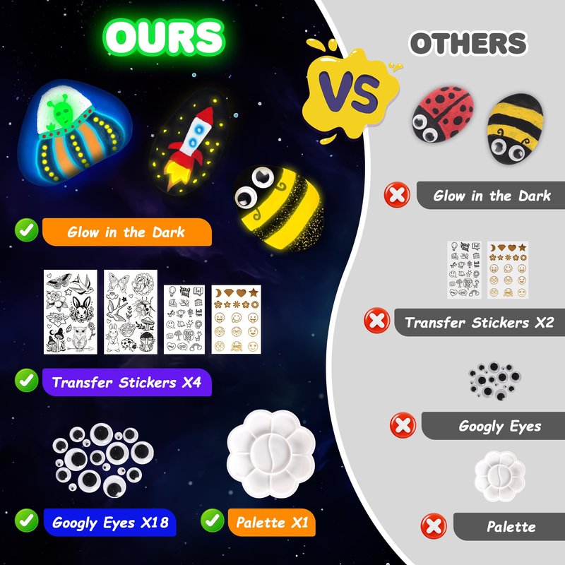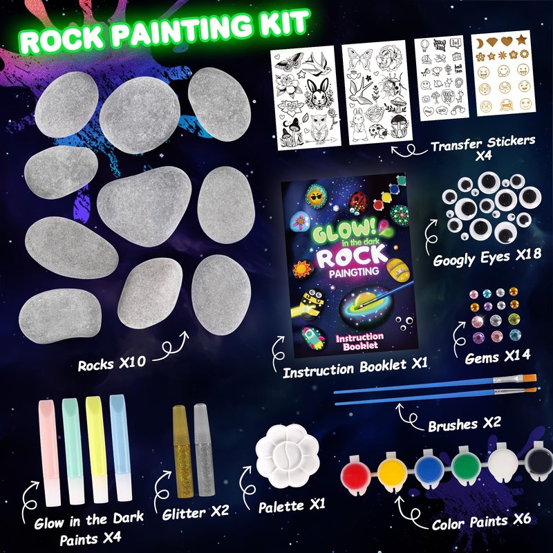 - Comprehensive Kids Arts and Crafts Set: Our Kid's DIY craft rock painting kit includes 10 natural rocks, 4 glow-in-the-dark paints, 2 glitter glue,14 gems, 6 standard paints, 56 transfer stickers,18 googly eyes, 2 brushes, 1 Color palette, and 1 instruction manual, Provide hours of fun for kids aged 6-12 year old.