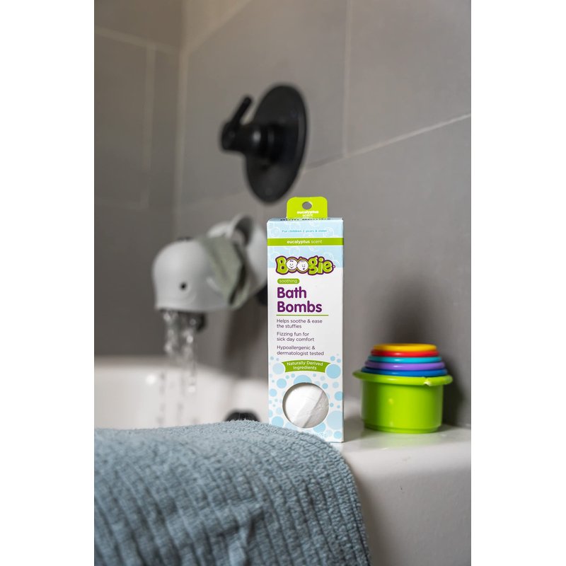 Make the most out of bathtime with Boogie Soothing Eucalyptus Bath Bombs -- they help soothe, comfort and relieve your little one when congestion, cold, flu and allergy symptoms are at their worst. Our gentle, soothing and naturally-derived bath bombs release boogie-busing vapors and are made with aloe and essential oils and without menthol, parabens and phthalates. They’re hypoallergenic, dermatologist tested, dissolve cleanly and are suggested for children 2+ years. From the makers of Boogie Wipes saline nose wipes. The Boogie brand was invented by Moms for Moms with the mission of making parenting easier (and cleaner!) for everyone. From our line-up of natural saline products that help gently clean and dissolve boogers and snot, to our soothing diaper rash cream that you can spray -- we keep the tiniest bodies and booties covered with great products that you and your baby will love. From the bottom of our hearts - Welcome to the Boogie Family! Made with love in the USA and distributed by ELEEO BRANDS.