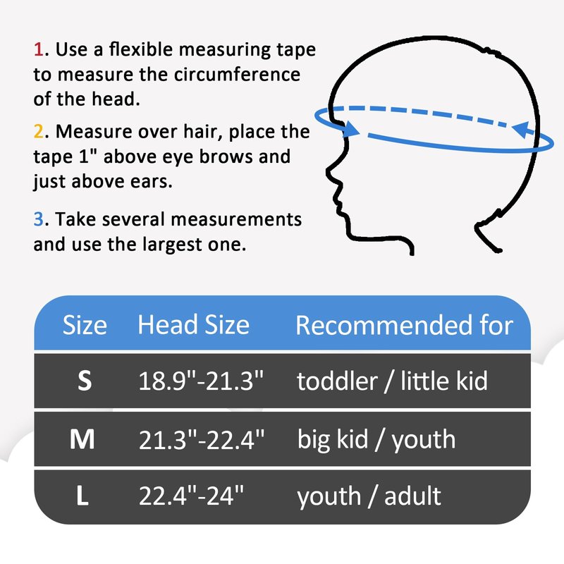 - 3 sizes available. Small: 18.9"-21.3" (48-54 cm), suitable for kids 2-8 years old. Medium: 21.3"-22.4" (54-57 cm), suitable for youth 8-14 years old. Large: 22.4"-24" (57-61 cm), suitable for people aged above 14.