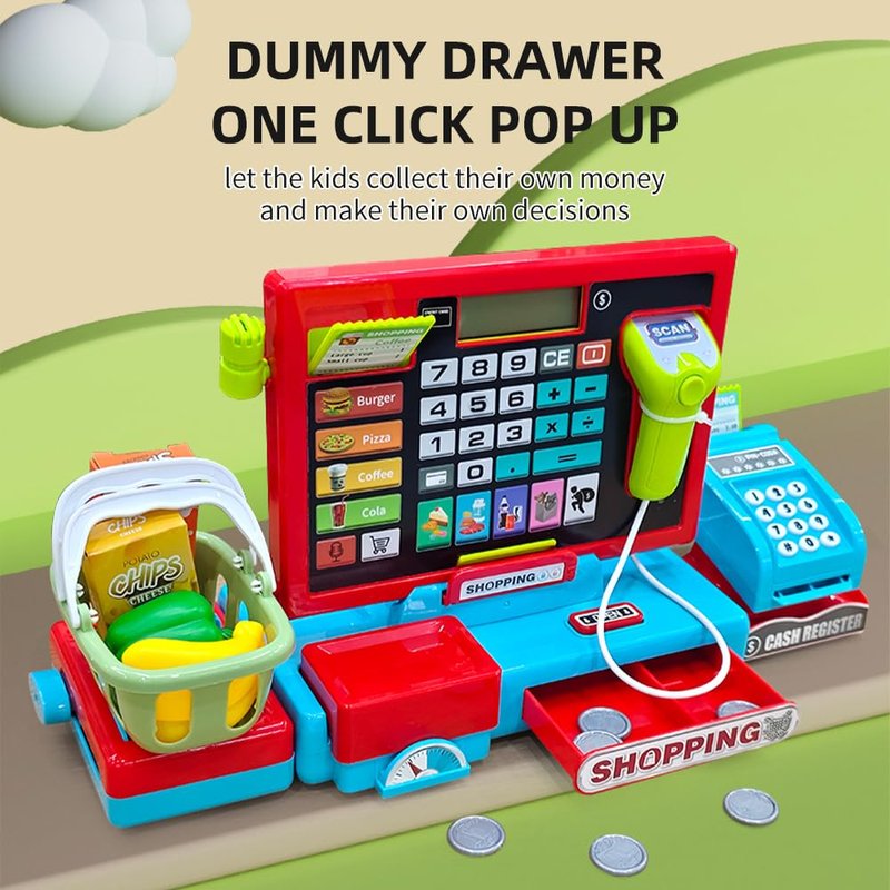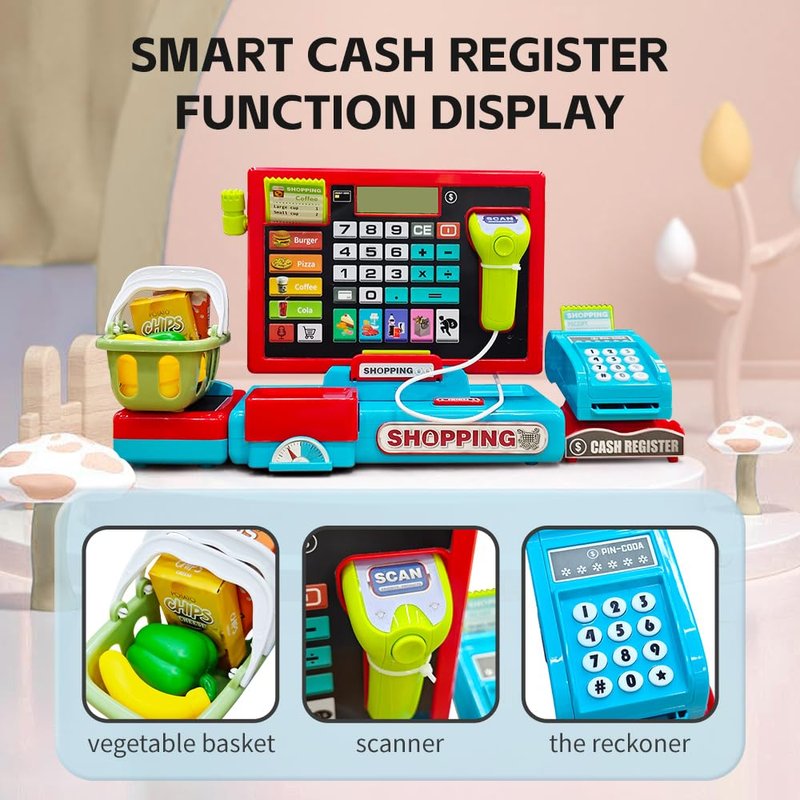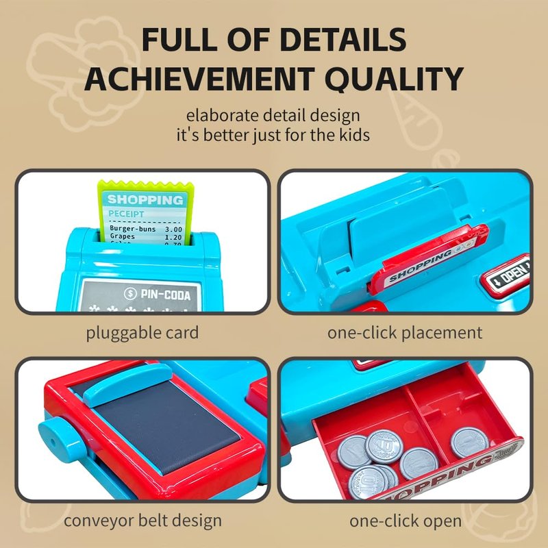 - ✅【Realistic Role Play】: This kids cash register toy pretend play store comes with a movable conveyor belt, cash register and drawer keys and scanner, the scanner lights up and makes a "beep" sound when scanning food toys. The realistic effect makes children more immersed in playing the role of cashier. Role-playing games can help your children become more social, cooperative and learn to share.