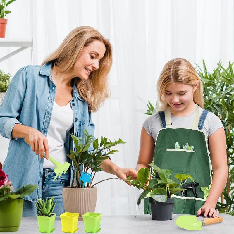 - š±ćPackage Included ćComes with everything your child needs to explore the joys of gardening! This comprehensive set includes a wooden handle alloy rake, fork, trowel, watering can, gloves, apron, tote bag, plant pots, and DIY bookmark kits