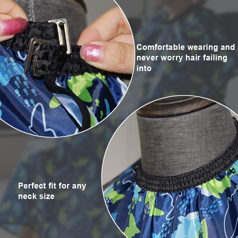 - 120*100cm (47 * 39 inch) kids haircut cape , with a metal buckle design at the neckline, it is easy to adjust tightness as you like. At the same time, the neckline fits to the neck perfectly and can prevent hair from falling into and make children comfortable and enjoying while hair cutting.