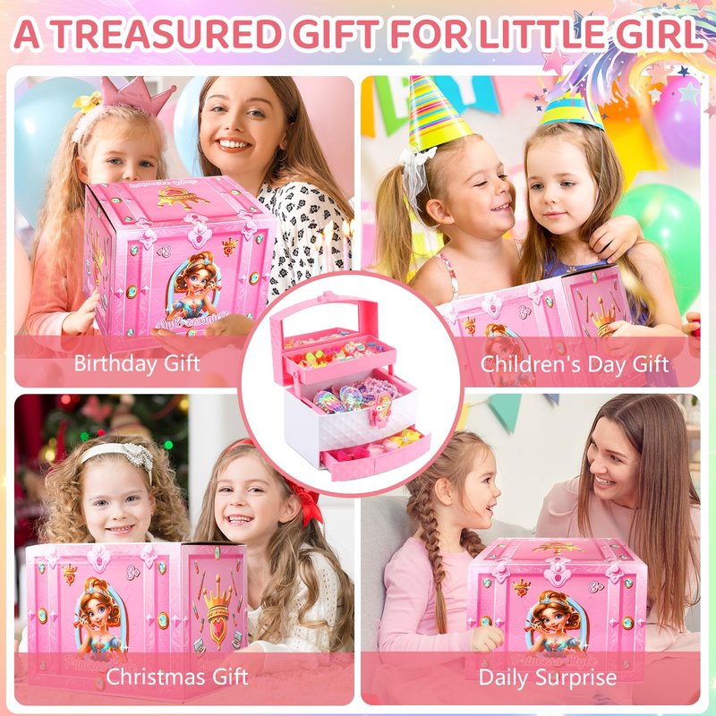 - EASY TO USE JEWELRY TOYS FOR GIRLS: The princess jewelry come in a very cute pink box for long-term storage and everyday use. There's also a great jewelry box organizer to put everything, with a easy to open unicorn button to protect all the accessories