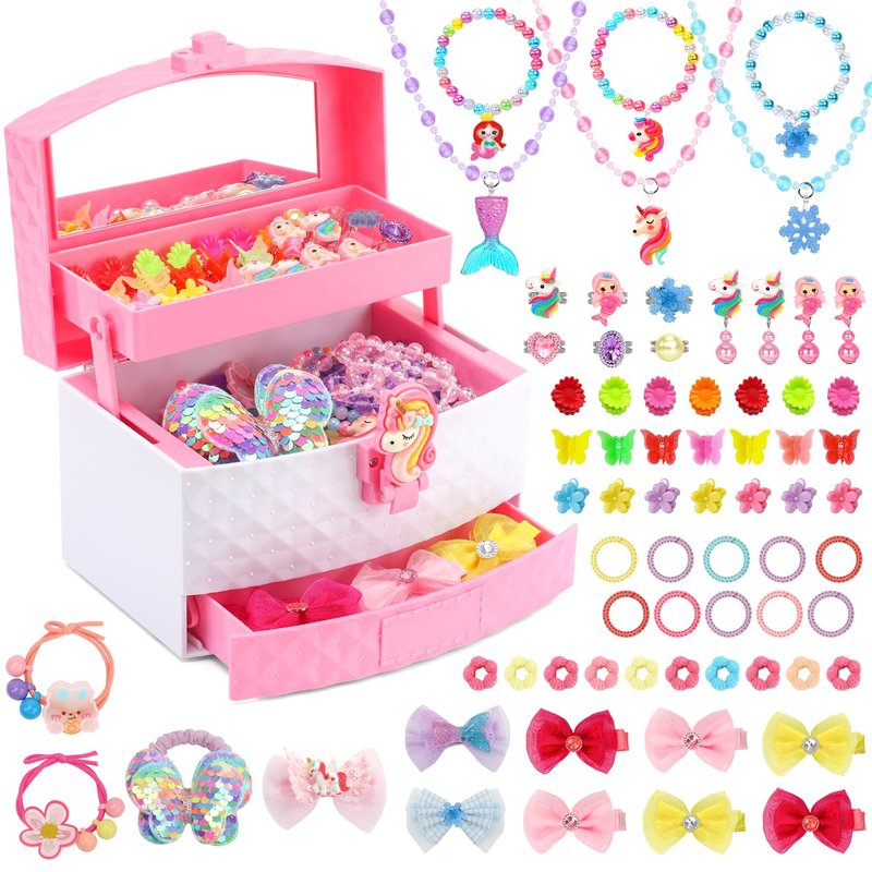 - VARIETY OF GIRLS JEWELRY DRESS UP SET: Includes 1*3-layer jewelry box, 3* princess necklaces, 3*bracelets, 2*earrings, 6*rings, 3*hair clips, 6*hair bows clips, 1*butterfly elastic hair tie, 2*ponytail hair ties, 20*mini hair ties, 21*mini hair claw clips