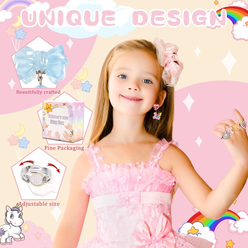 - Elaboration little girls jewelry:This camera style little girl jewelry box features 10 adjustable rings for kids and 4 pairs of clip on earrings for girls to keep your girls' fashion. Each kids rings for girls has a different design , Such as the animal rings, unicorn rings , star ring, butterfly ring, heart ring , Meet the many styles of girl jewelry. Girls toys age 6-8 for pretend play & dress up. Perfect for socializing and playing with best friend