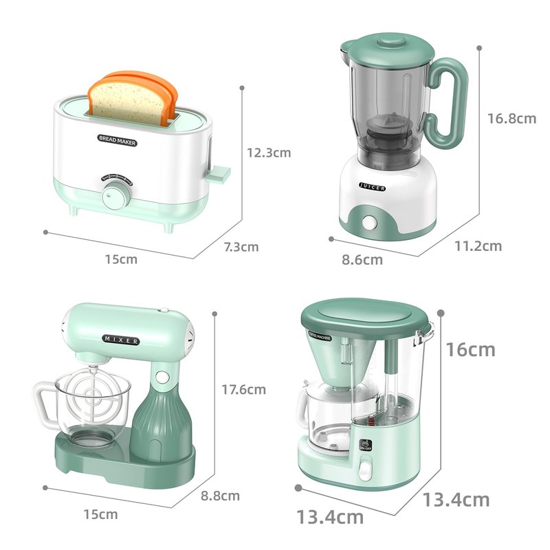 - Play Kitchen Set with Sound & Light: The toaster and blender produce sounds, while the coffee maker and mixer offer both sound and light. It's a good play kitchen set for kids aged 4 - 8. Each requires 2 or 3 AA batteries (not included)