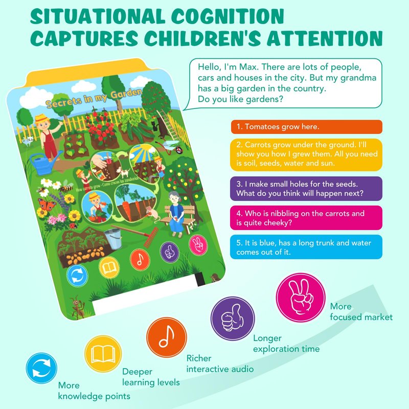 - Interactive, Situation-Based Learning:This educational toy immerses children in real-life scenarios, placing them at the heart of the story.By presenting questions and challenges through gameplay,the toddler tablet encourages critical thinking and problem-solving in a fun, stress-free environment.These interactive activities engage kids,enhancing cognitive skills and fostering creativity.They also help children explore unique talents,boosting self-confidence and inspiring imaginative thinking.