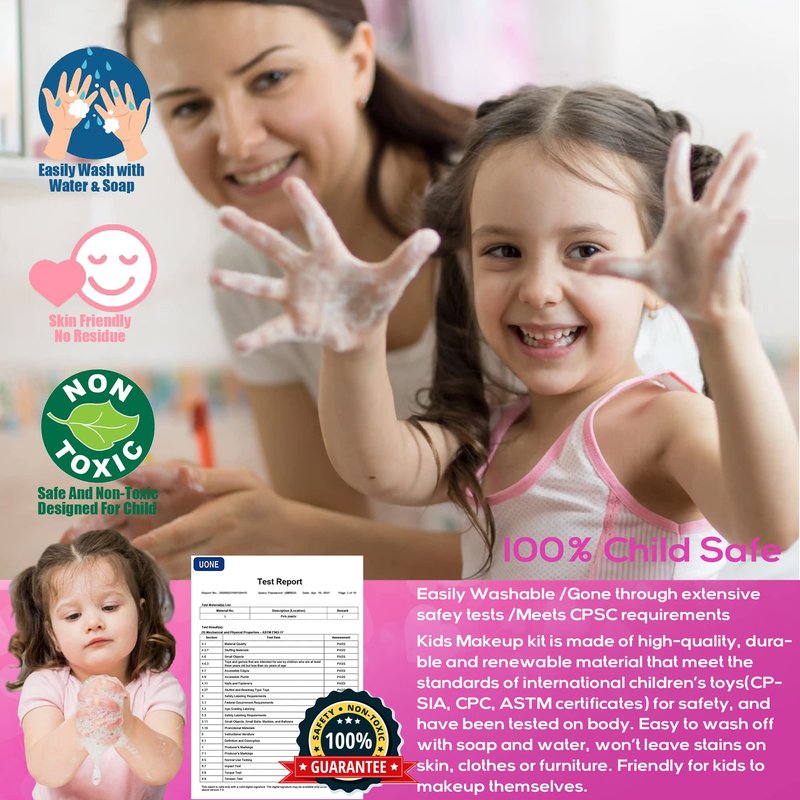 - 【Washable Makeup X 100% Child Safe】:Kids makeup kit for little girls set use water-soluble formula, no added preservatives, mild and non-irritating, no burden on the skin.Kids Makeup Kit Toys for Girls The smooth exterior design makes it not easy to be damaged and protect children's soft hands, Easy to Wash, Non-Toxic. Meet the standards of international children’s toys(CPSIA, CPC, ASTM certificates)birthday gifts, a Christmas gift, Easter toys,toys for 5+ year old girls