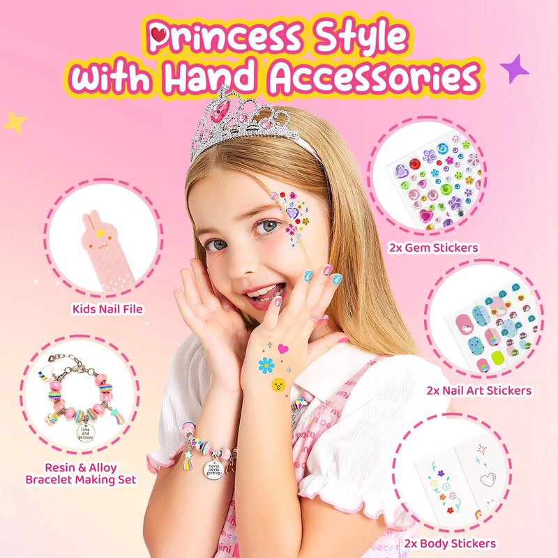 - Kids Makeup Kit Jewelry Box: This playful makeup kit includes everything a little princess needs, featuring safe & washable cosmetics, a handle mirror, and a range of fun colors. Let kids explore their creativity and style, transforming into their own version of a princess!