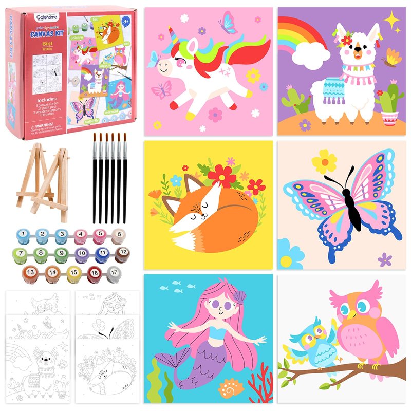 - PAINTING ART SET: Kids paint by number kit is perfect for ages 4-8-12 and comes with everything your little one needs to get started, including 6 6x6 inch pre-drawn canvas with simple and fun designs, 17 paints, 6 brushes and 2 wooden easels. Wooden easels are easy to display their own masterpieces,