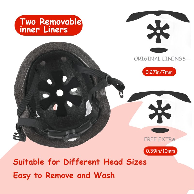 Medium size helmet includes 2 sets of interchangeable pads with different thickness (7mm and 10mm) to fit kids’ head size. The pads are removable for cleaning, keep kids away from odor and dust.