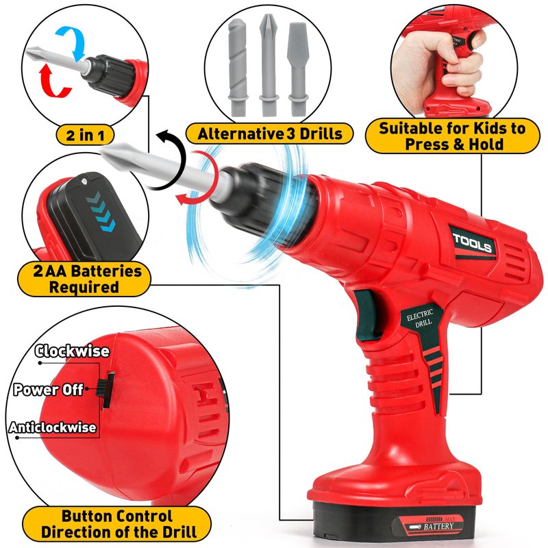 - 【Electric Power Toy Drill】The battery-powered drill comes with 3 interchangeable drill bits for different functions and needs, which can be switched simply by kids. When press the switch, the drills provides realistic movements and operating sounds that arouse toddlers' interest. It also can be automatically rotated clockwise or anticlockwise by switching the button. Great 3 4 5 6 year old boy toys for developing fine motor skills and hand-eye coordination.