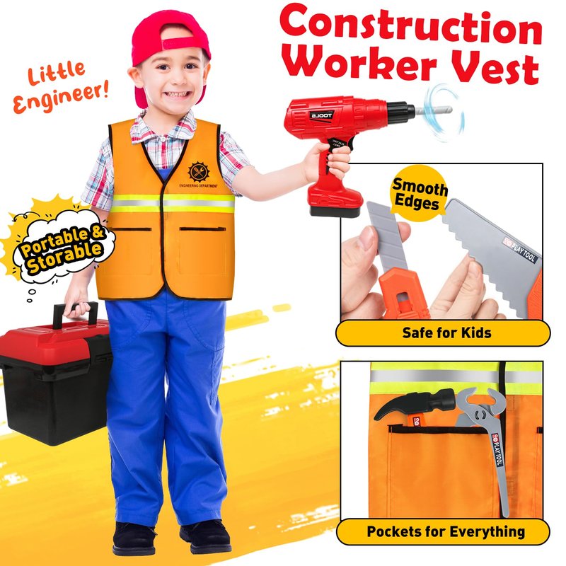 - 【Fun Pretend Play for Toddlers 3-5】The large capacity of the kids tool box for easy storage encourage toddlers to clean up all tools toys after playing. The tool kits designed with portable handle is perfect for kids to take on trip or anywhere conveniently. Moreover,kids can dress up with the construction suit as a little engineer to pretend to do woodworking, developing their interests in construction.