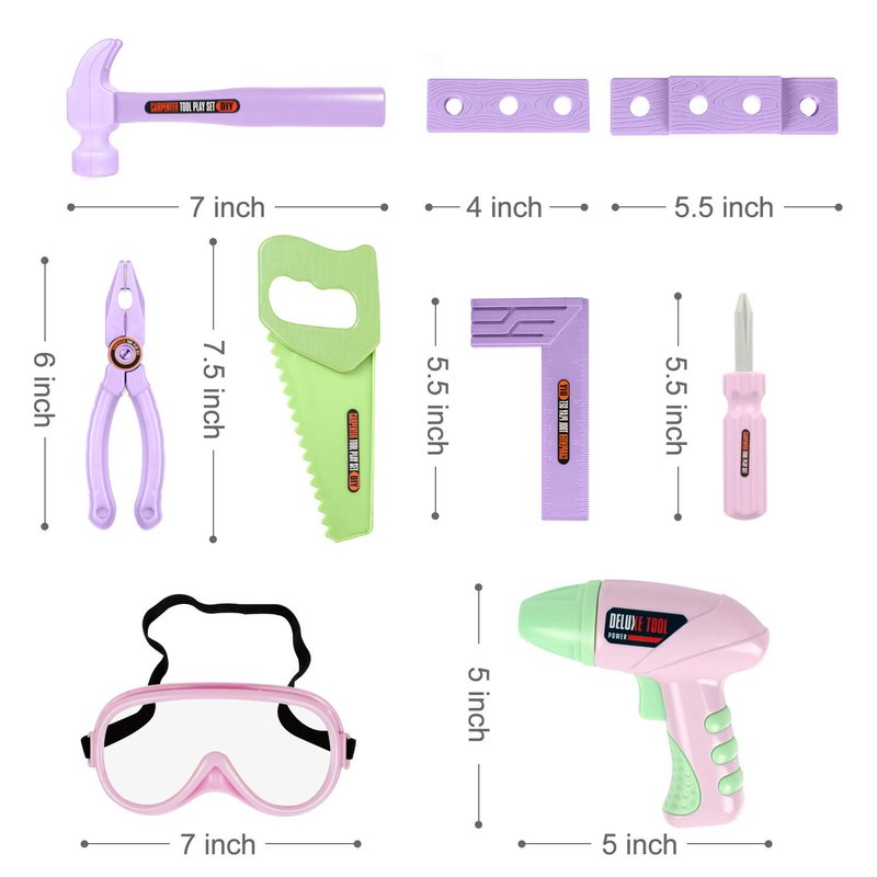 - Kids Tool Set: This pink play tools kit includes Tool Box, Screwdriver Handle, Hammer, Hand Saw, Friction Drill, Angle Ruler, Pliers, Safety Goggles, 2 Nails, 2 Bolts and 2 Nuts, 2 Play Boards, 3 Drill Bits/ Screwdriver Heads.