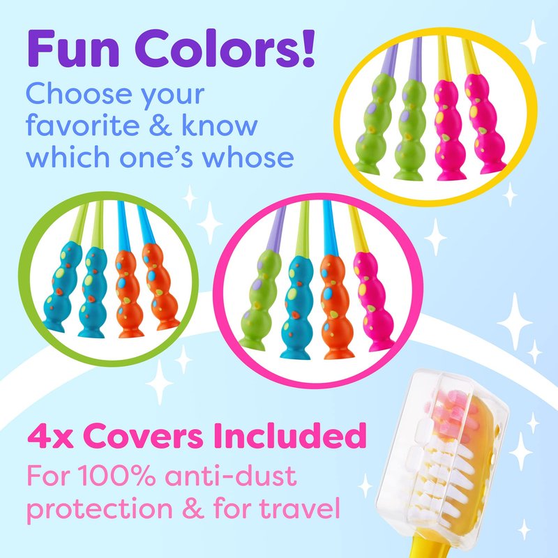 Kids Toothbrush 4 Pack - Soft Bristles with Suction Cup - Toothbrush Kids, Child Sized Brush Heads (3-10 Year Old) Kid Toothbrush with Easy Storage - Toddler, Girl & Boy Set (4-Pack, Multi-Color)