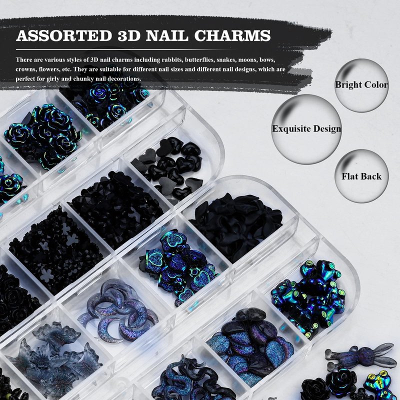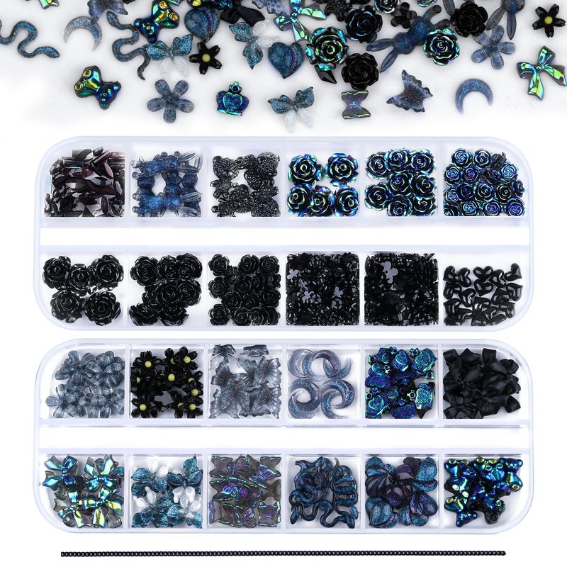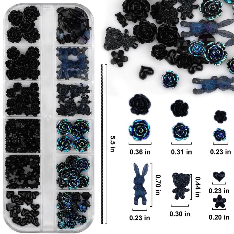 Kikonoke 2 Boxes 3D Flower Nail Charms Butterfly Bow Snake Rabbit Bear Shaped Nail Art Rhinestones Gems for DIY Nail Art Decoration Making Craft (Black)