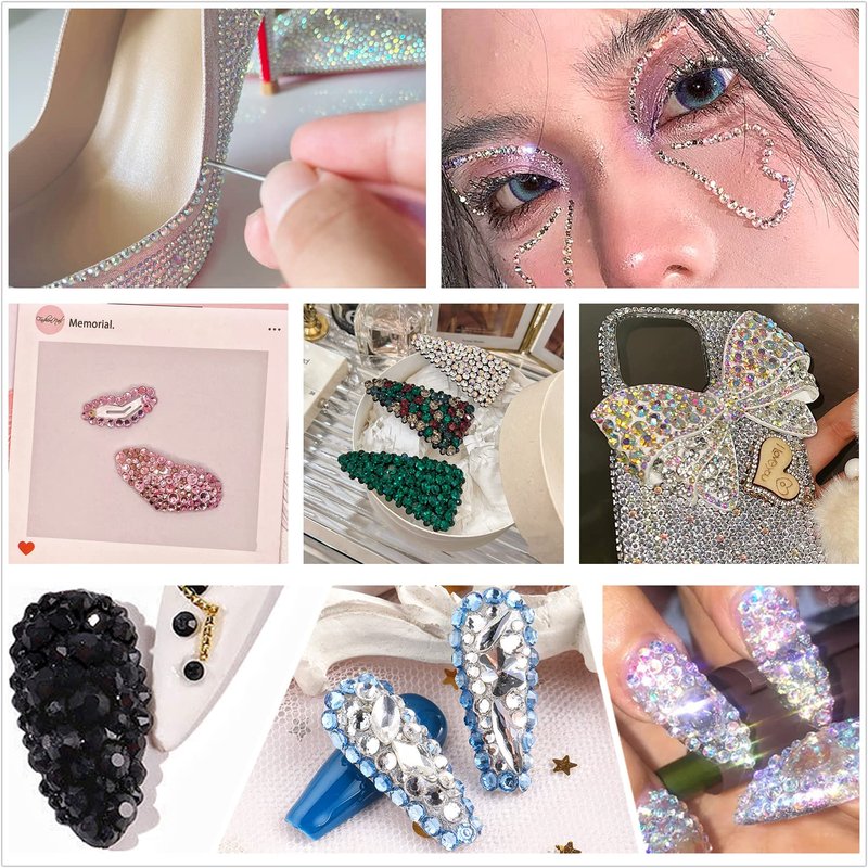 - Wide applications: The colorful rhinestones not only can decorate your nail art, but also can create unique pattern for your mobile phone case, glasses, handmade card, facial eye makeup, clothes, shoes, jewelry design, furniture, wallets, cosmetics, electrical appliances, wedding dress, books, guitar, tablets, car license plates, table scatter, resin crafting, other DIY crafts designs etc.