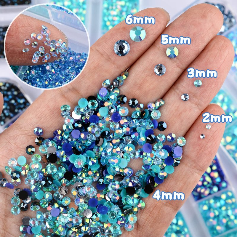 - Unique color combination: The nail decoration kit contains 6 colors, including transparent sky blue AB, jelly aqua blue AB, black blue AB etc. Each color has 5 sizes: 2mm(1000 pcs), 3mm(580 pcs), 4mm(330 pcs), 5mm(160 pcs), 6mm(60 pcs).