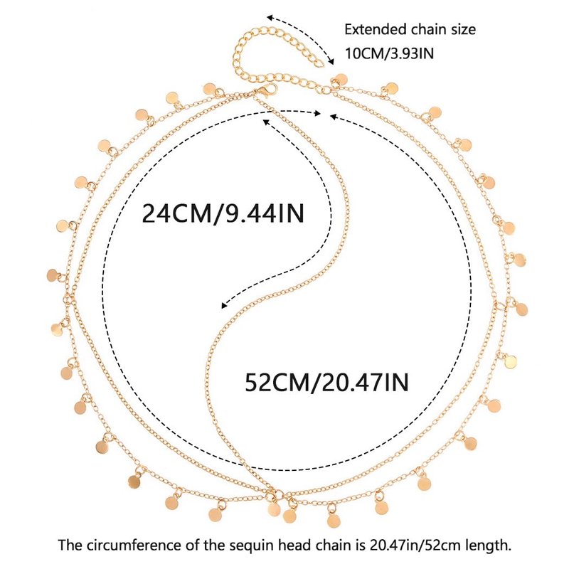 - Sequins hair chain has a circumference size of 20.47 in/52 cm length. Extension chain approx size: 3.93 in/10 cm length.