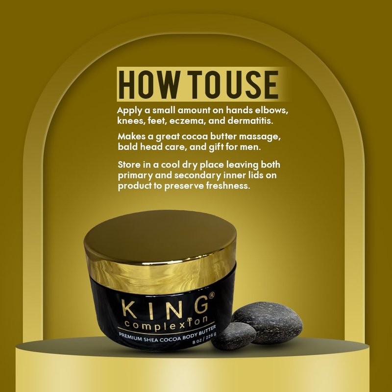 - Treats Eczema, Dermatitis, Dark Elbows, And Dark Knees: Our King Complexion Shea Cocoa Body Butter meets the unique needs of melanin rich skin unlike lotions that are too watery.